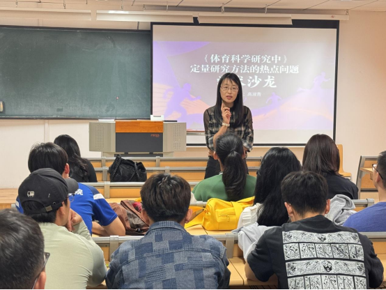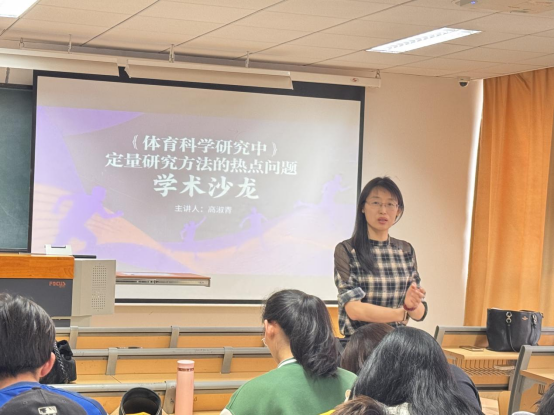 活动开始,高淑青老师通过讲解高定量研究概念,使同学们能通过数量化手段,收集数据资料并深入分析,挖掘体育科学现象背后的规律。介绍了问卷法、实验法、测量法等常用定量研究方法,为同学们开展科学研究提供了实用工具。