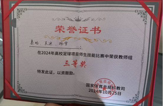 由国家体育总局科教司主办的首届高校足球项目师生技能比赛于2024年10月23日至25日在山东体育学院日照校区举办。我校派出秦旸、吴迪、杨雪三名教师参赛,经过激烈角逐获得三等奖。