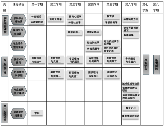 毕业实习安排在第八学期进行,共16周(含实习准备周),计8学分。毕业实习采用集中和分散结合指导和管理的方式,要求学生了解实习单位训练、教学、管理等内容,通过实习,具备实践基本能力。按照相关大纲的要求,完成规定时数与内容,由校内指导教师和实习单位指导教师共同对实习生进行综合考核。
